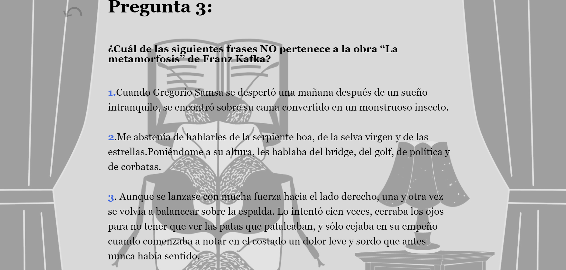 El jugador después de leer cada fragmento de una obra literaria, debe responder la pregunta haciendo clic en la opción correcta. Gana la partida quien haya aprendido y disfrutado del juego.